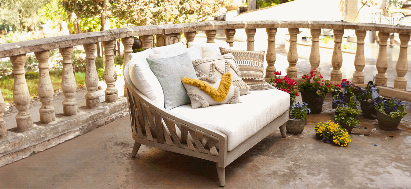Made for the weather and made to weather time and tide with aplomb, Palecek’s Boca collection includes sofas and sunbeds, side and coffee tables, stools, matching chairs and an all-teak dining table. The pre-weathered gray finished teak wood is complimented by wide bands of UV-protected woven synthetic rope in taupe and grey. Seating cushions are loose, water and UV protected, and customizable.