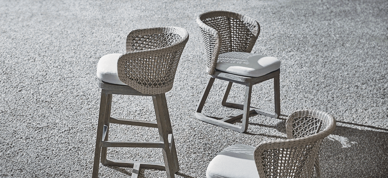 All Laguna seating have 100% teak wood frames and legs. They come in a weathered grey finish with a double-wall back of woven marine grade synthetic rope in taupe and grey tones.The rope is treated with maximum UV protection. The barstool comes with an aluminum footrest on the front stretcher.