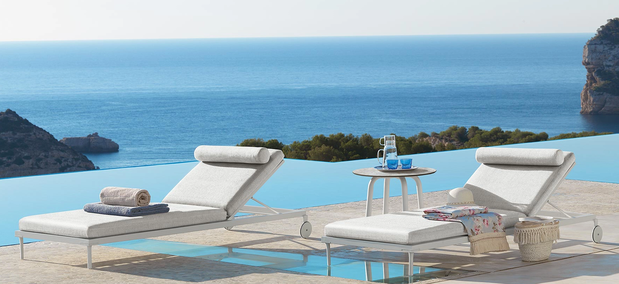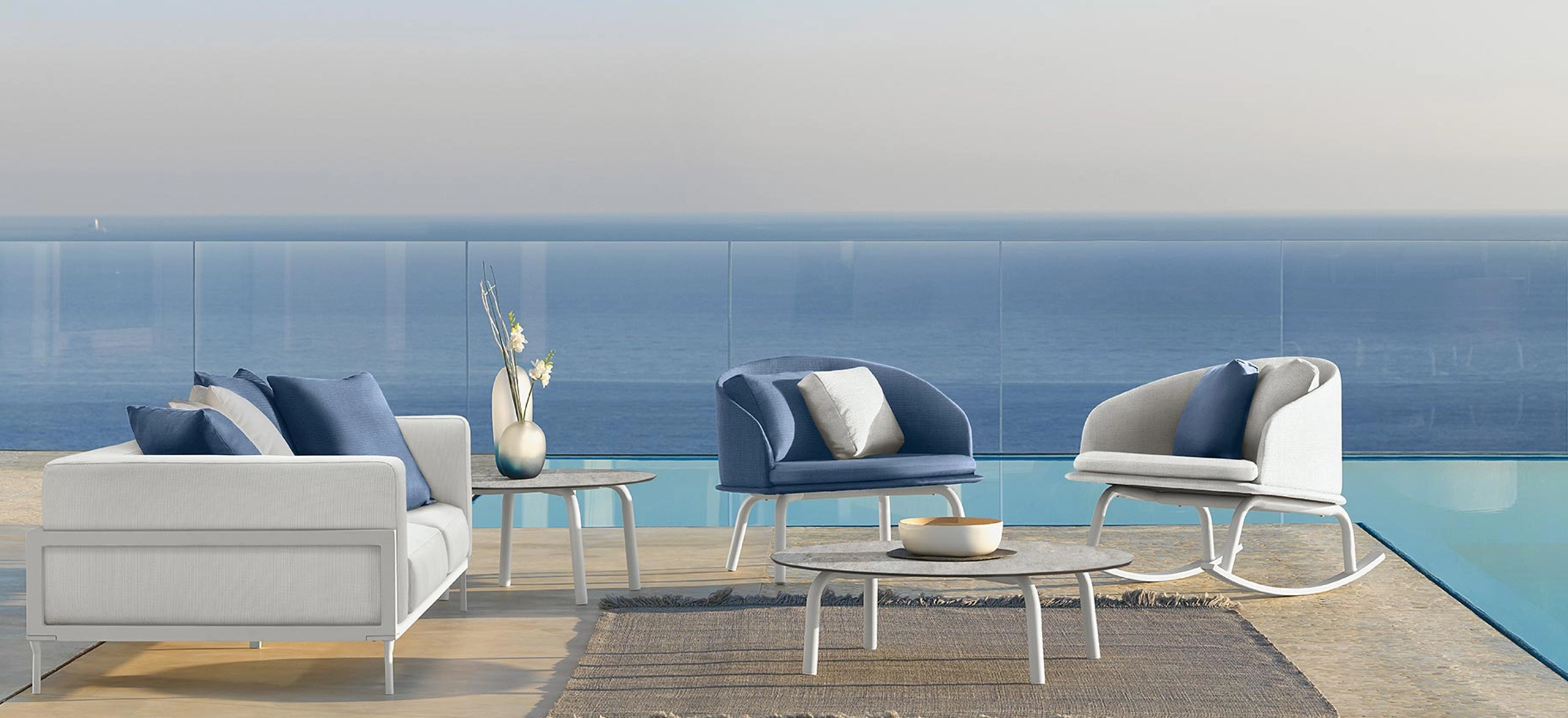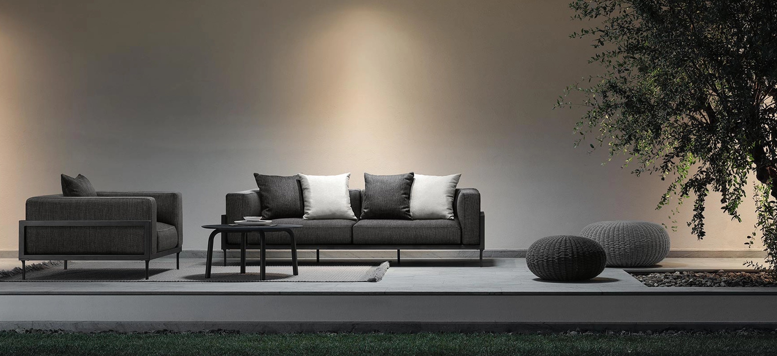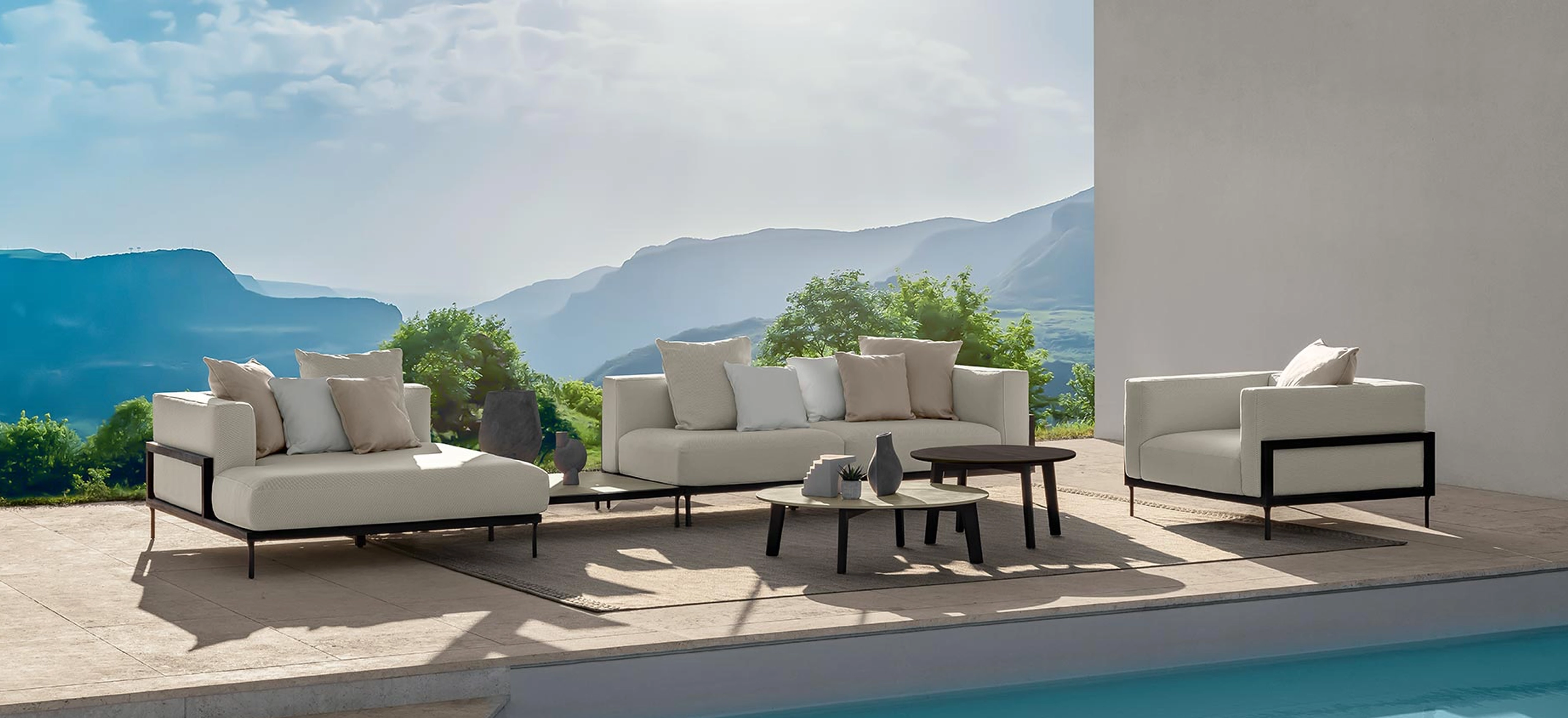 The lightness of aluminum construction meets soft cushioning, modern lines and surfaces and elegant upholstery. Suitable for indoors, lanai or outdoors.