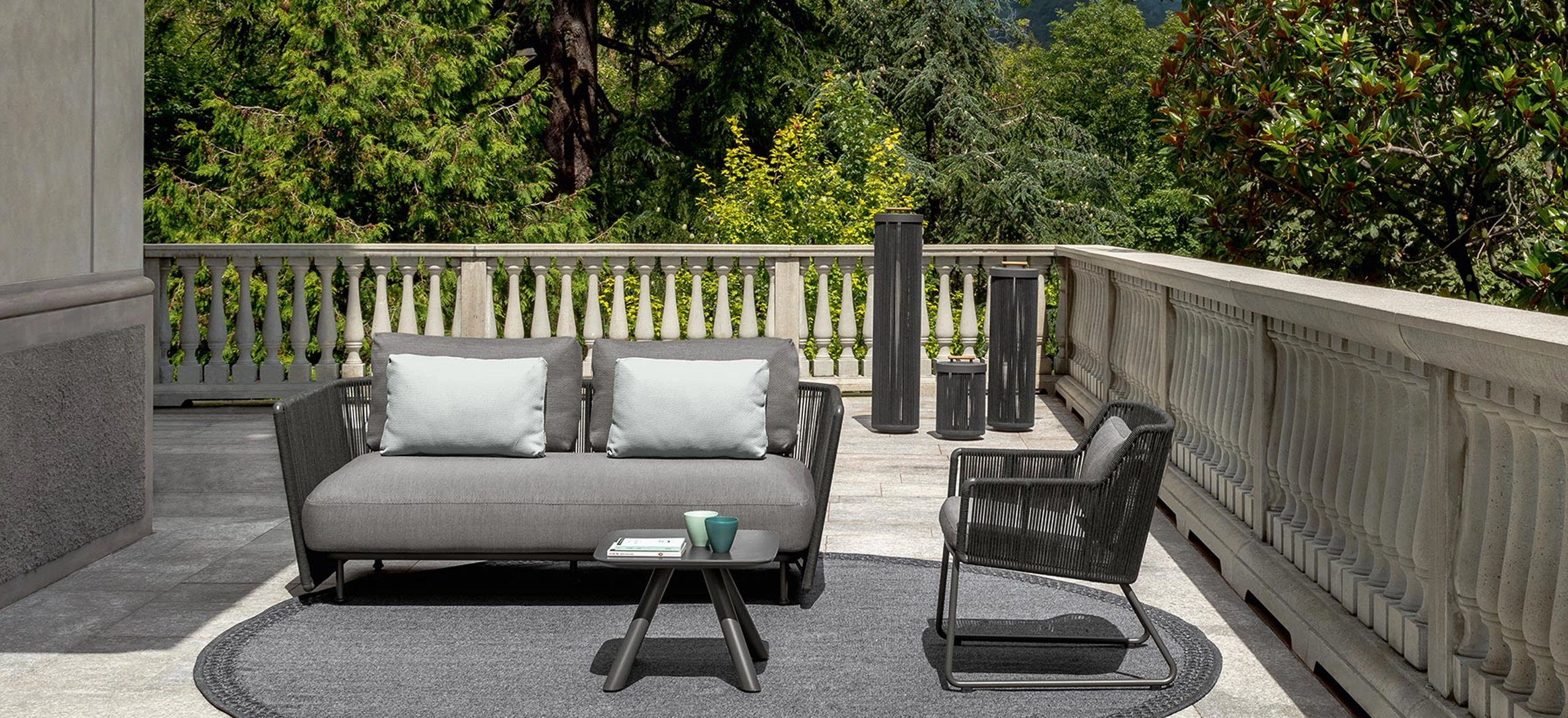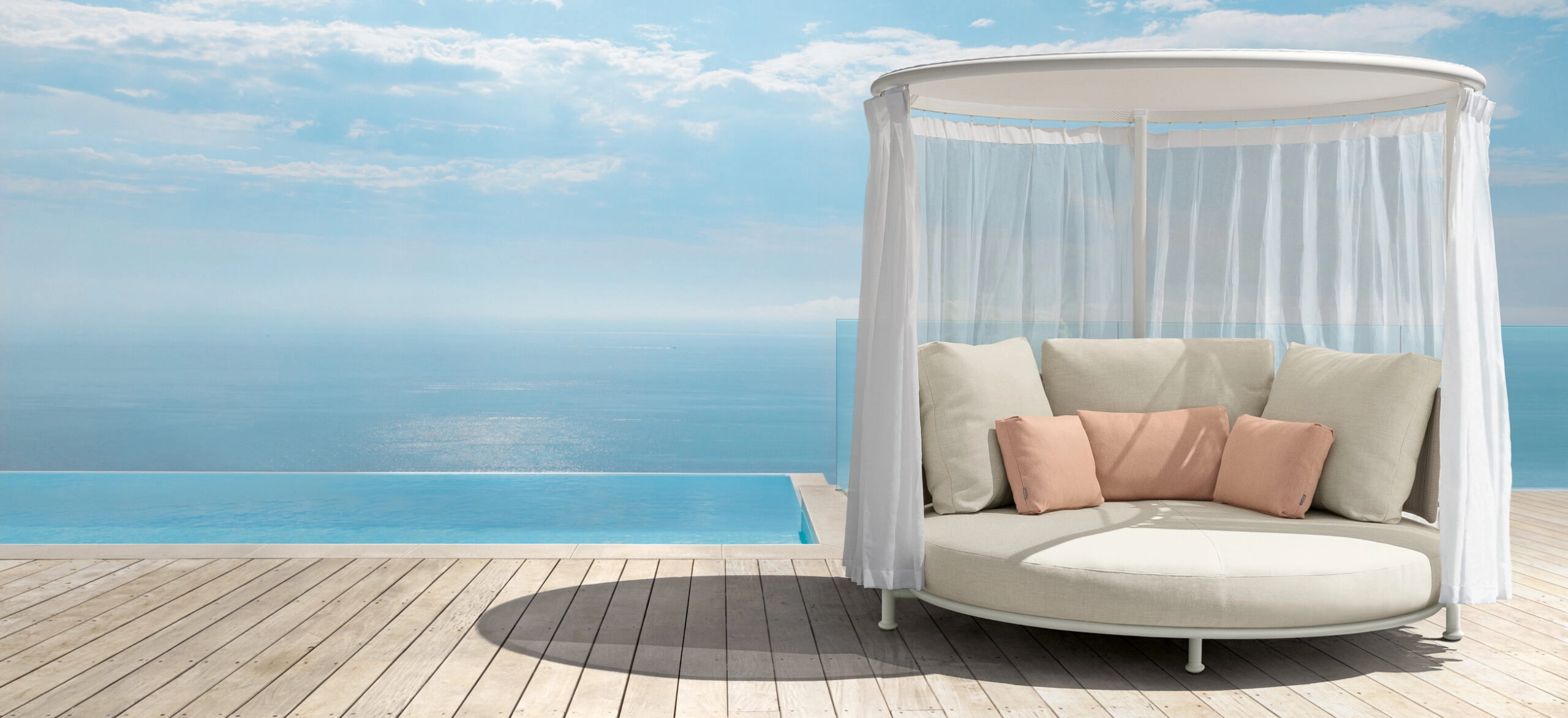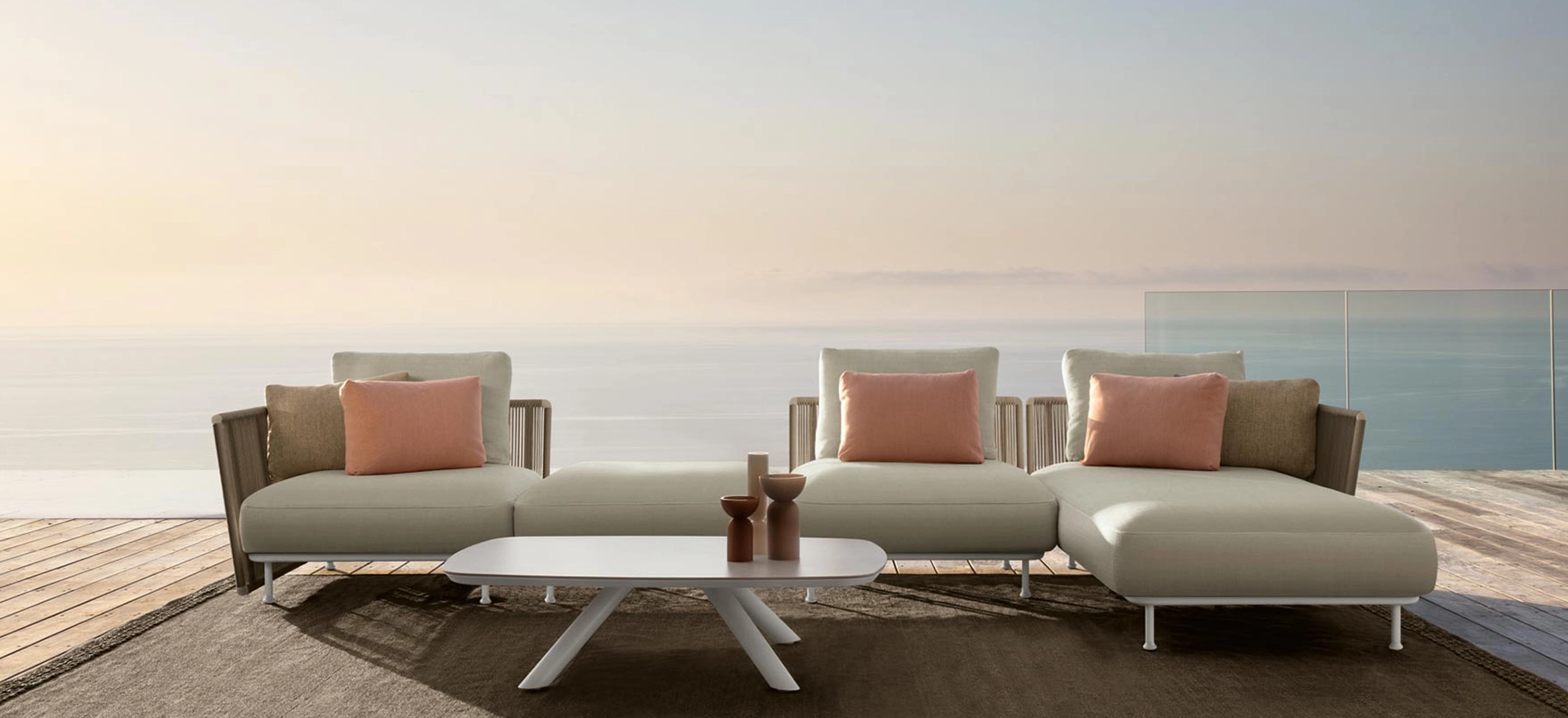 Usability, comfort and longevity were the keywords that inspired Talenti’s Coral collection. Rope embellished cushiony sofas, daybeds and poufs are contrasted by thin curved chairs and minimalist sunbeds. Modern tables and lamps complete the look.