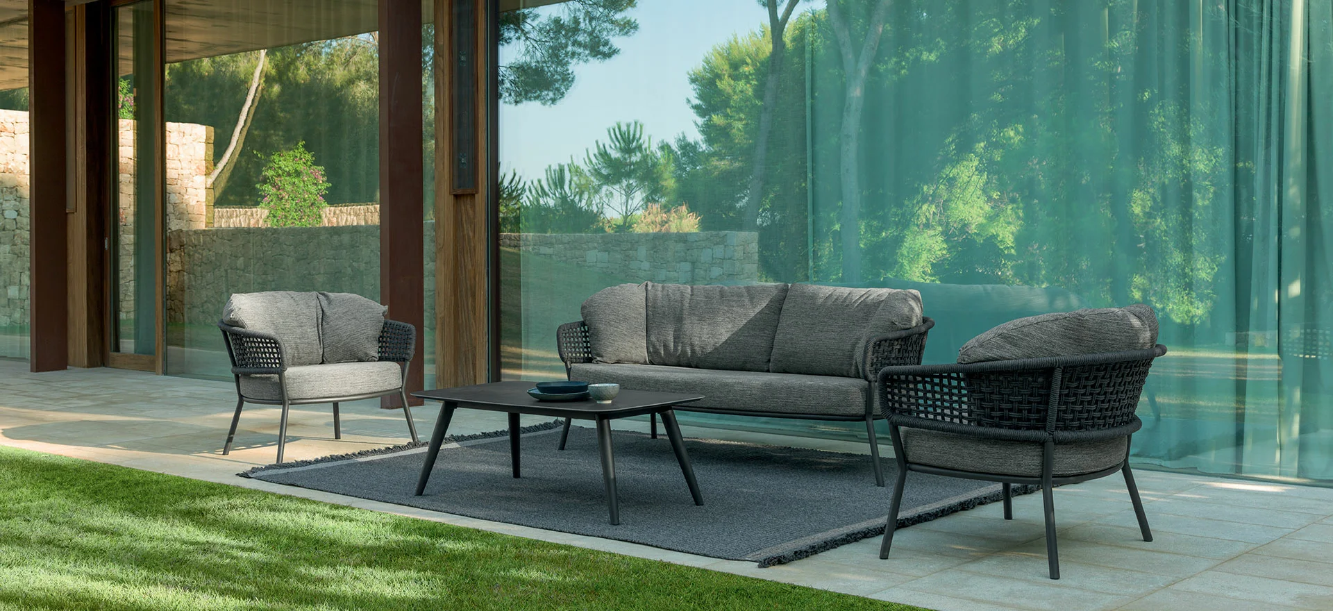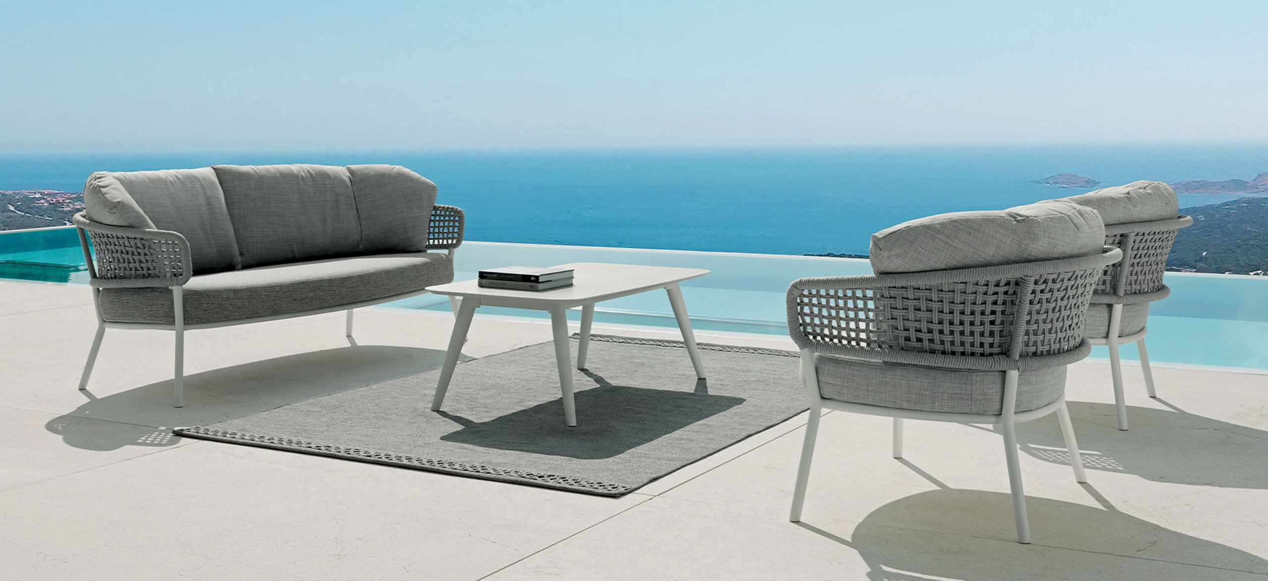 Crescent shaped aluminum frames, basketweave roping, and luxurious curvy cushions in soothing shades of gray distinguish this nine-piece collection.  Seating selections include sofas, love seats, daybeds, sunbeds, oversized armchairs and even a swing! Practical and sleek expandable dining tables, coffee, side and bar tables with high stools complete the ensemble.